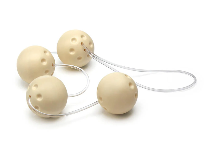 As esferas são unidas por um cordão de silicone atóxico, que facilita o manuseio, o posicionamento e a retirada após os exercícios.
